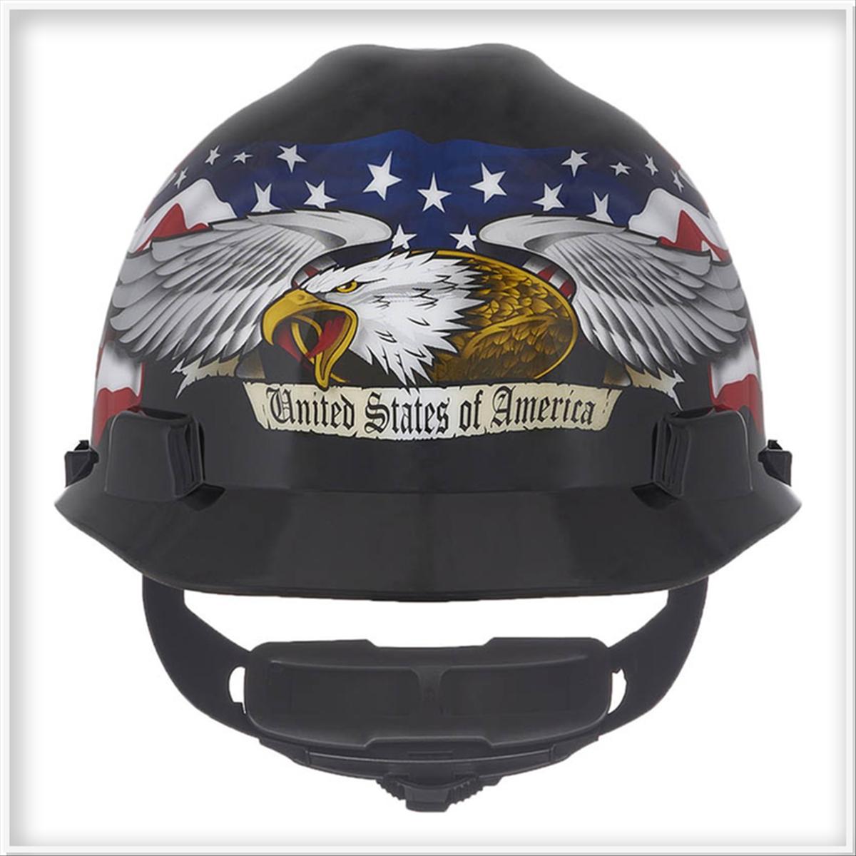 MSA V-Gard® Freedom Series™ Hard Cap features an eagle with flowing U.S flag to express patriotism and provides industrial-strength head protection. Cap featuring bright design has superior shiny finish on the V-Gard® shell while providing attractive and elegant look. Cap is lightweight, durable and features Fas-Trac® suspension for optimum comfort. Cap featuring slots accept all MSA accessories and provide impact resistance with personal comfort. Logo can be custom-imprinted on top of the cap design. Cap has United States of America imprinted underneath and is used in agriculture, asbestos abatement, chemical construction, domestic applications, electric utility, hazardous material applications, indoor air quality, medical applications, mining, nuclear applications, oil and gas industry, paper and pulp applications, sand blasting, sanding and grinding applications, spray painting, water/wastewater and welding applications. It meets ANSI Z89.1 Type I Class E standard.
