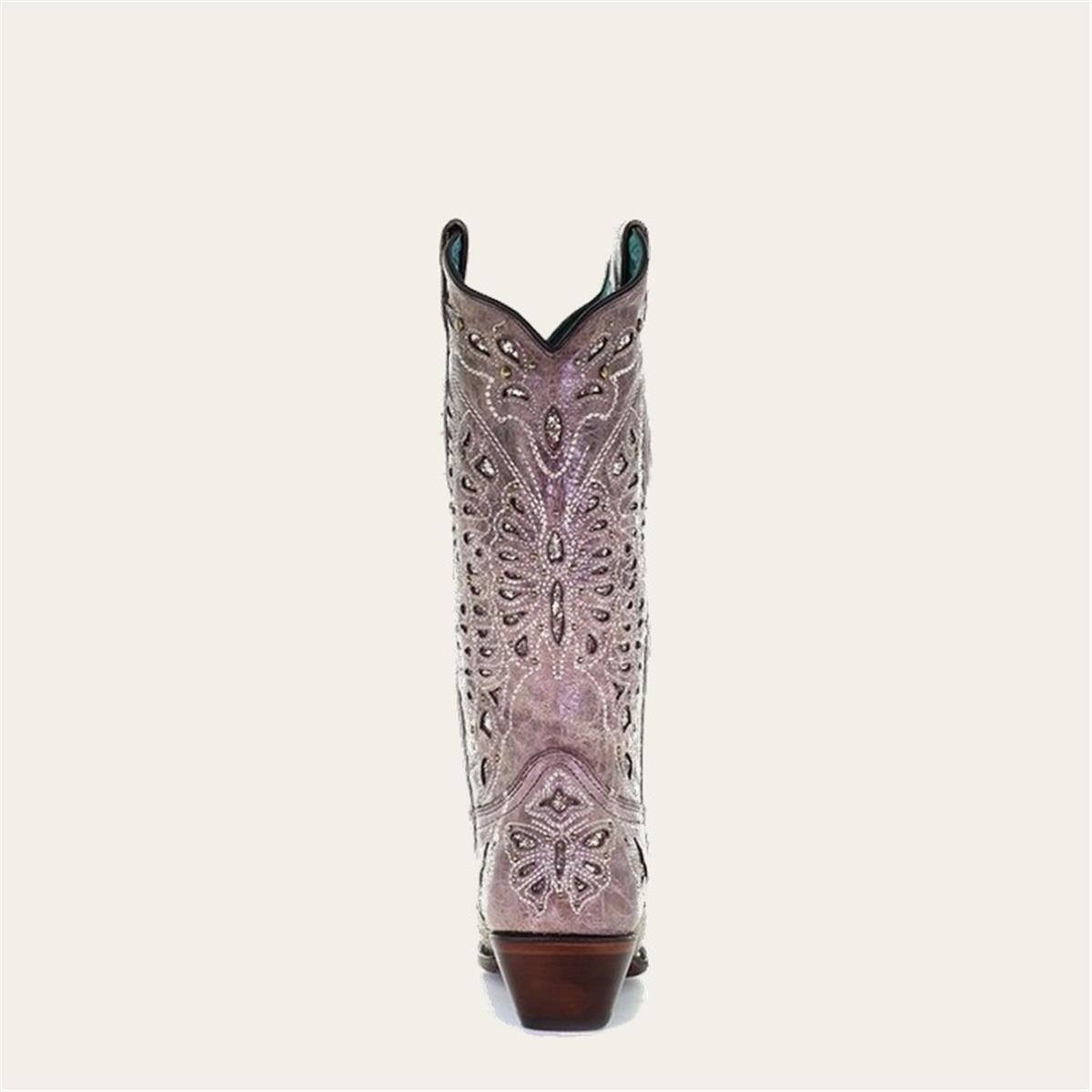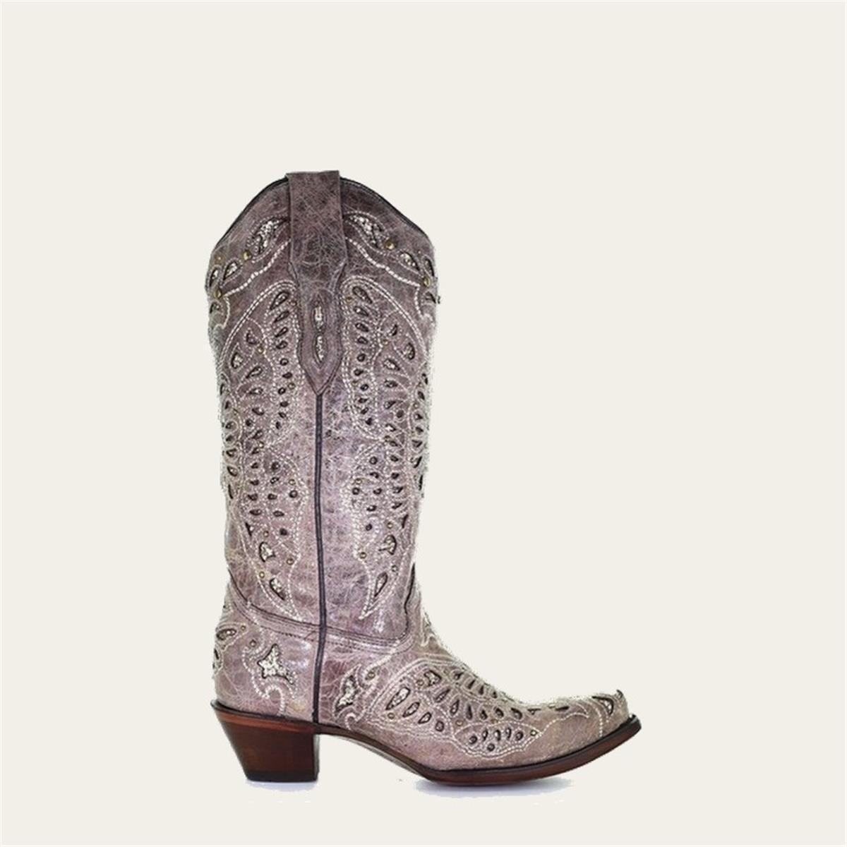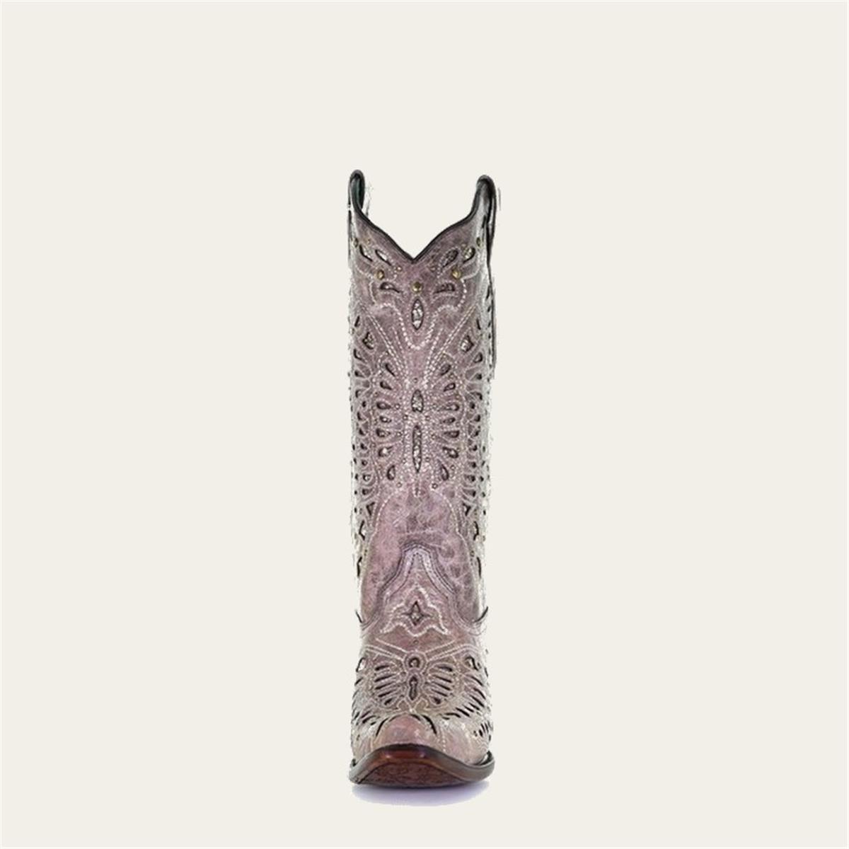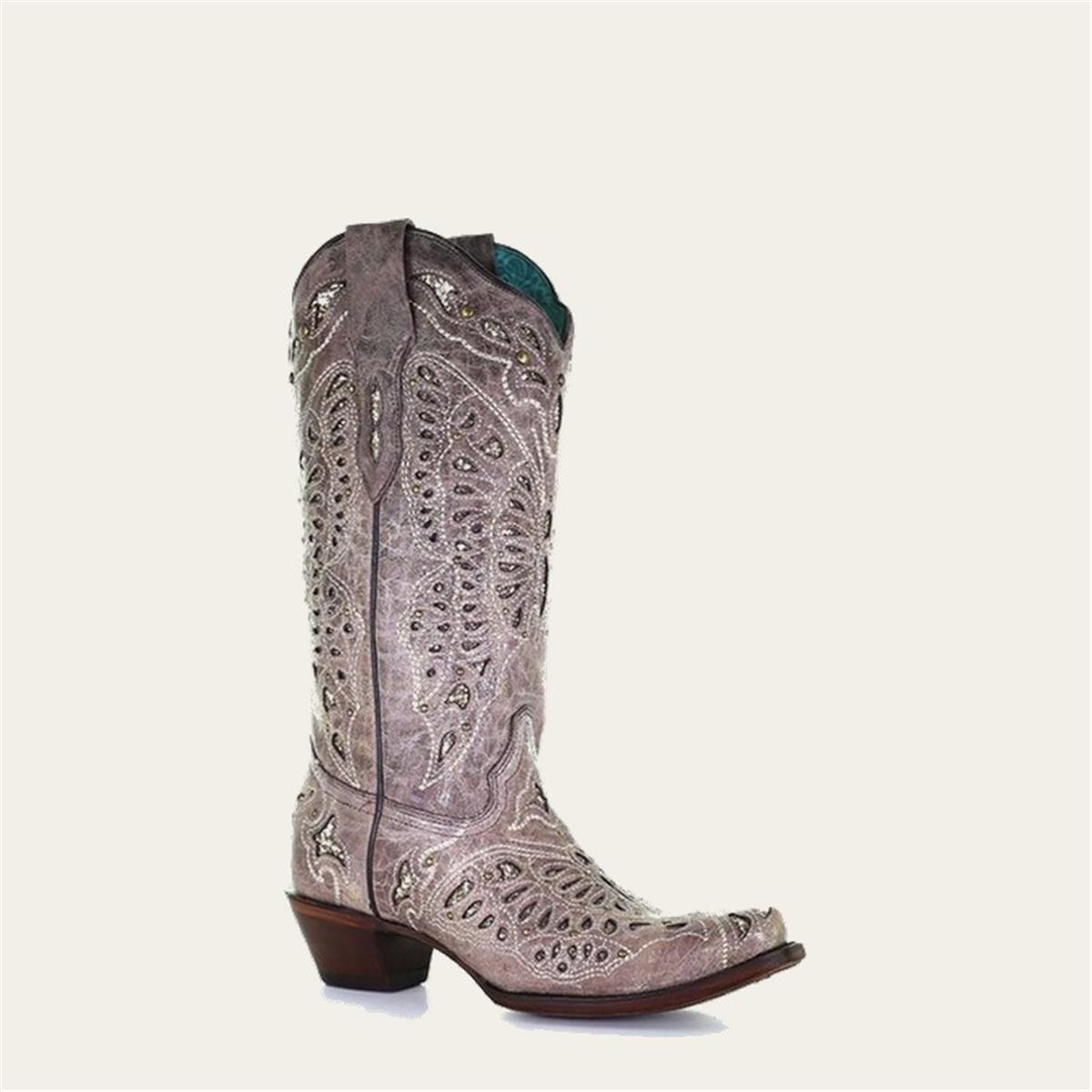 Flirty and fun, this Women’s Corral Boot is a must-have for your western wardrobe. These snip toe boots feature champagne glitter cutouts in a butterfly shape. A charming look for special occasions, date night, or even a western wedding. The silhouette of this cowgirl boot features a scalloped collar and a 2” riding heel.