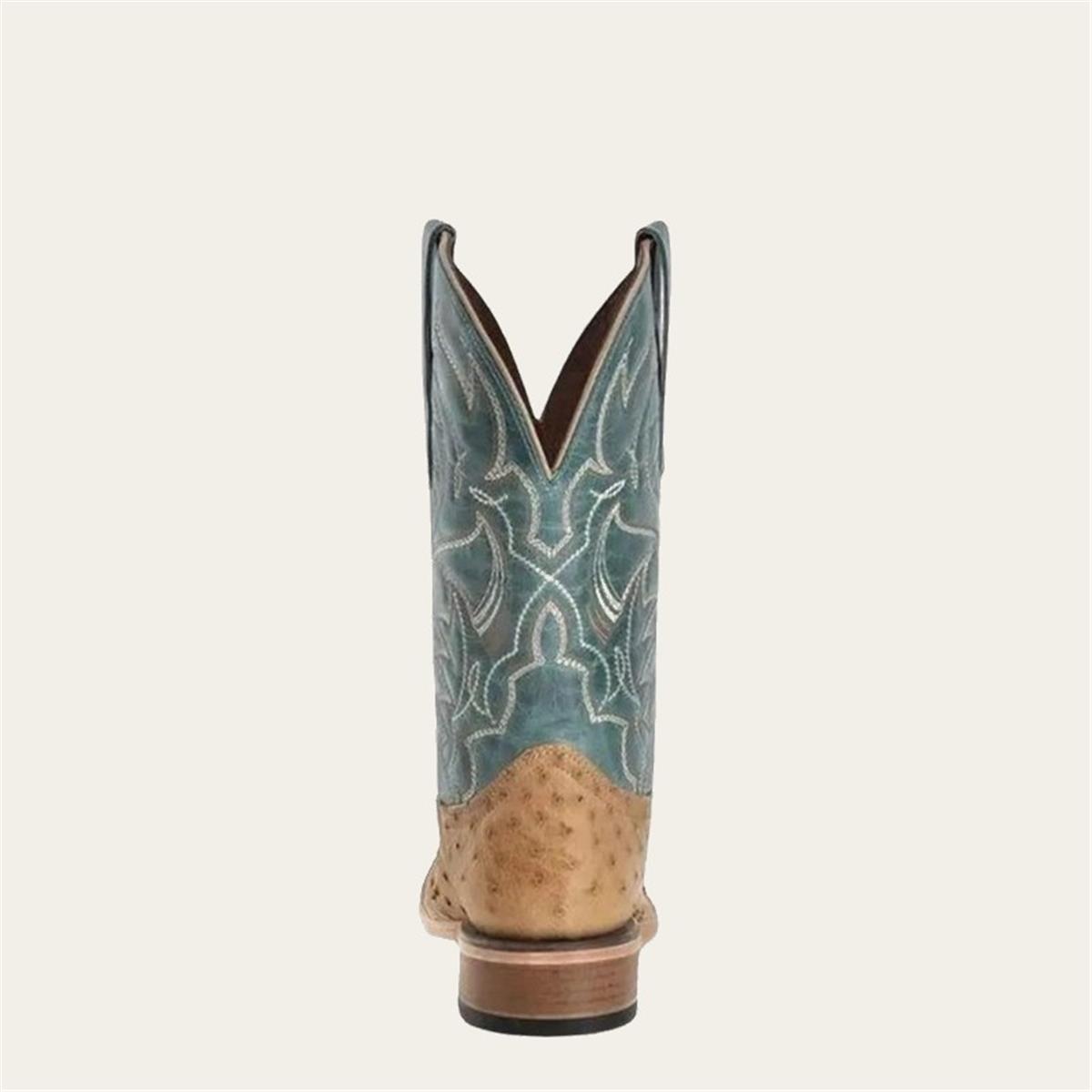 This L6139 cowboy boot boasts a unique combination of blue cowhide and sand ostrich materials, creating a striking and daring look.