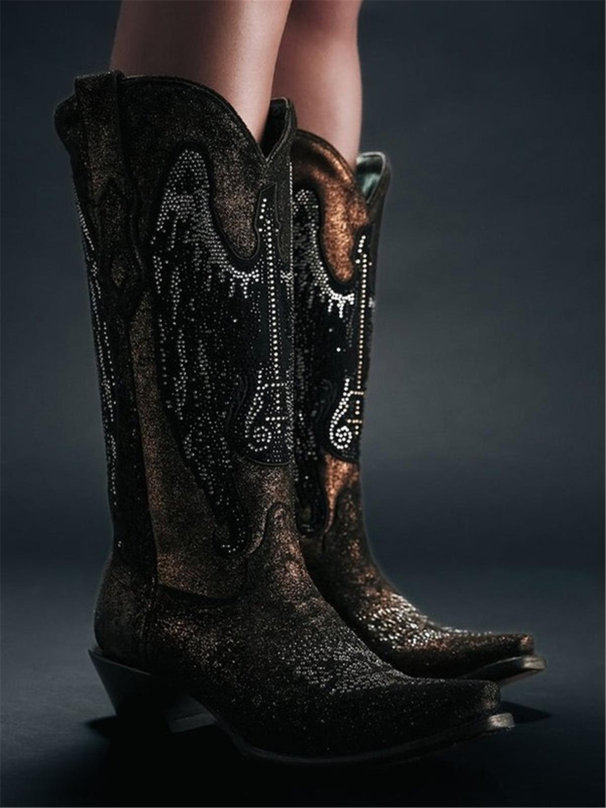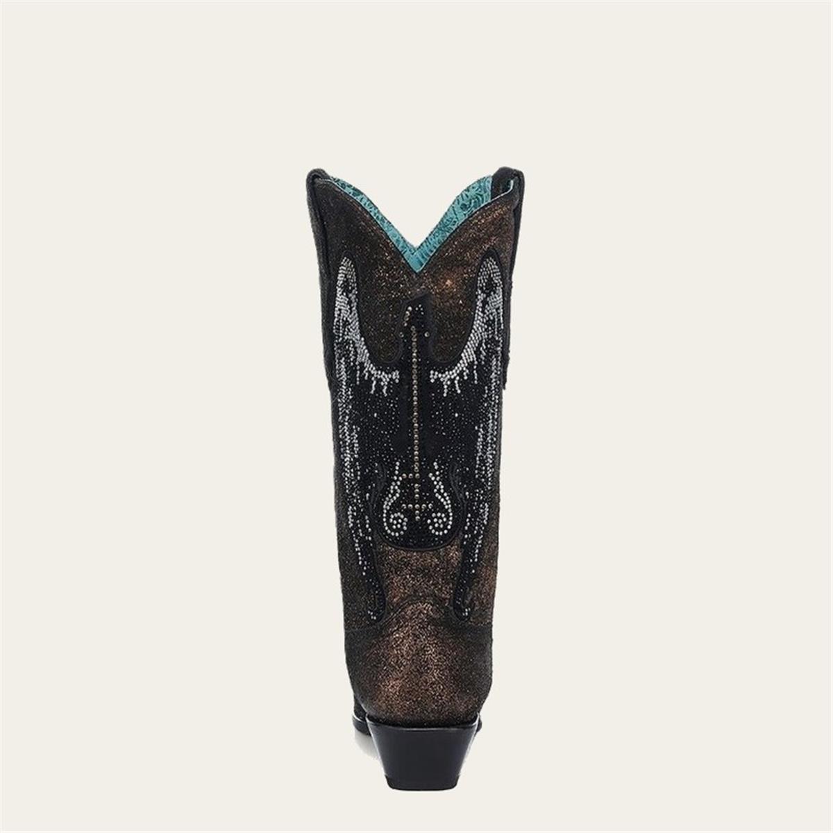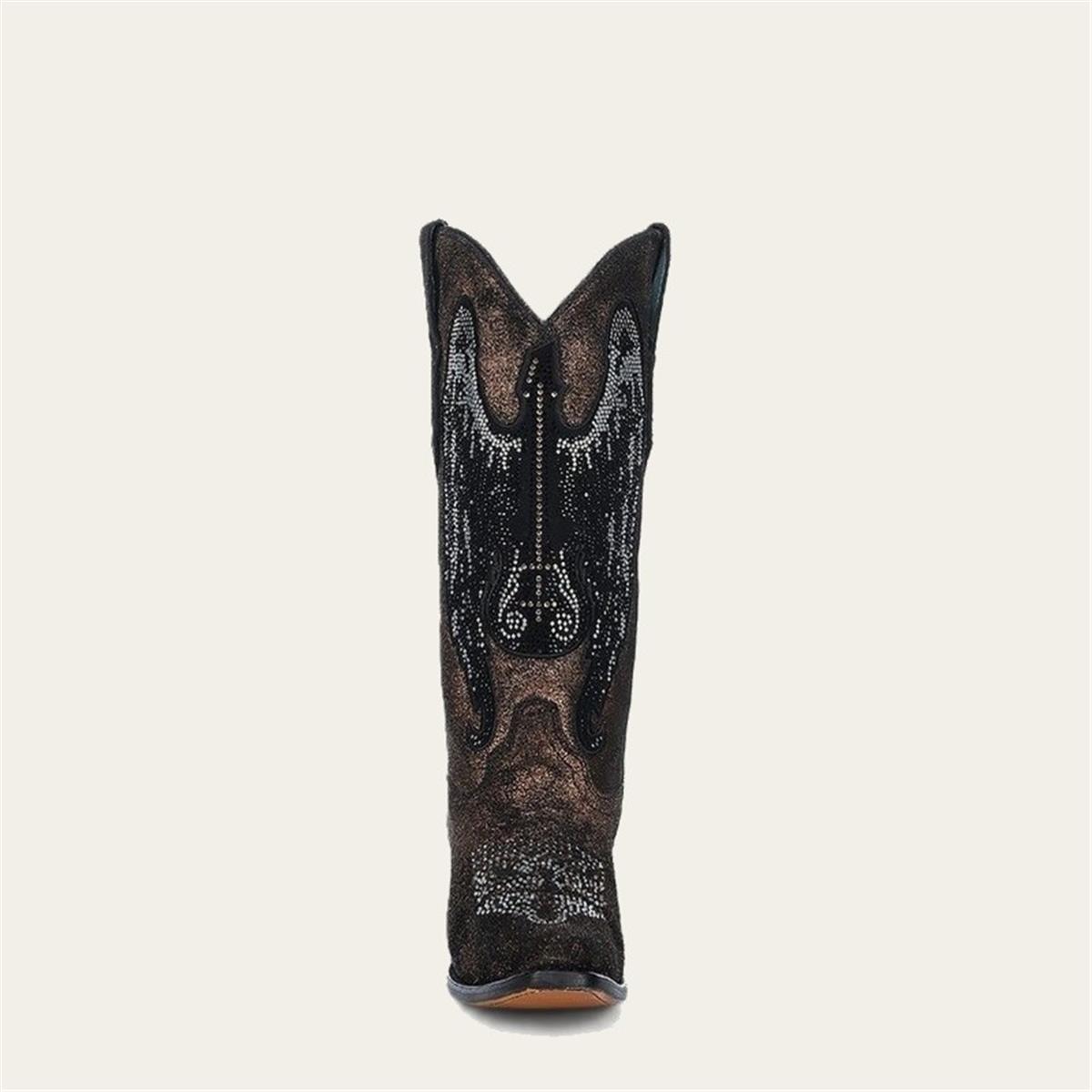 Eye-catching, stylish, and feminine. Our crystals winged guitar boot will soon become your favorite.