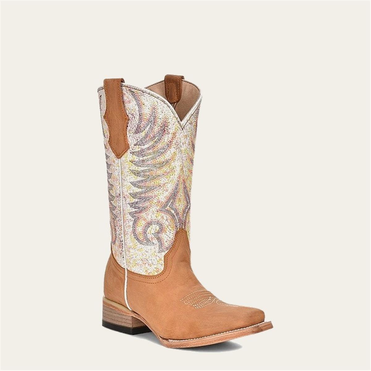 Add a pop of color and personality to your western wear with this playful and unique Corral boot. The soft tan leather foot pairs beautifully with a vibrant crackle-finish shaft featuring multicolor wing-inspired embroidery. It’s the perfect blend of comfort, craftsmanship, and standout style.