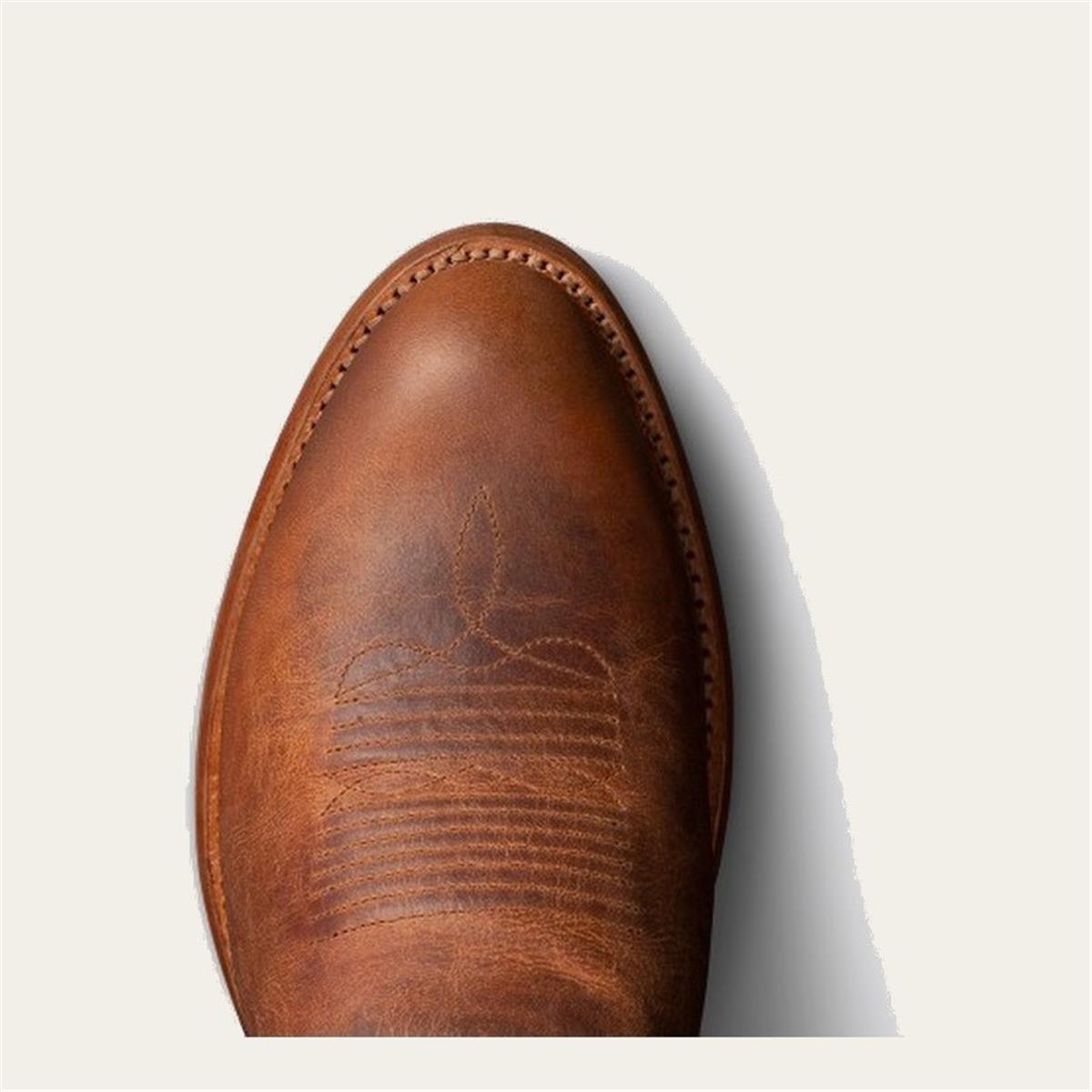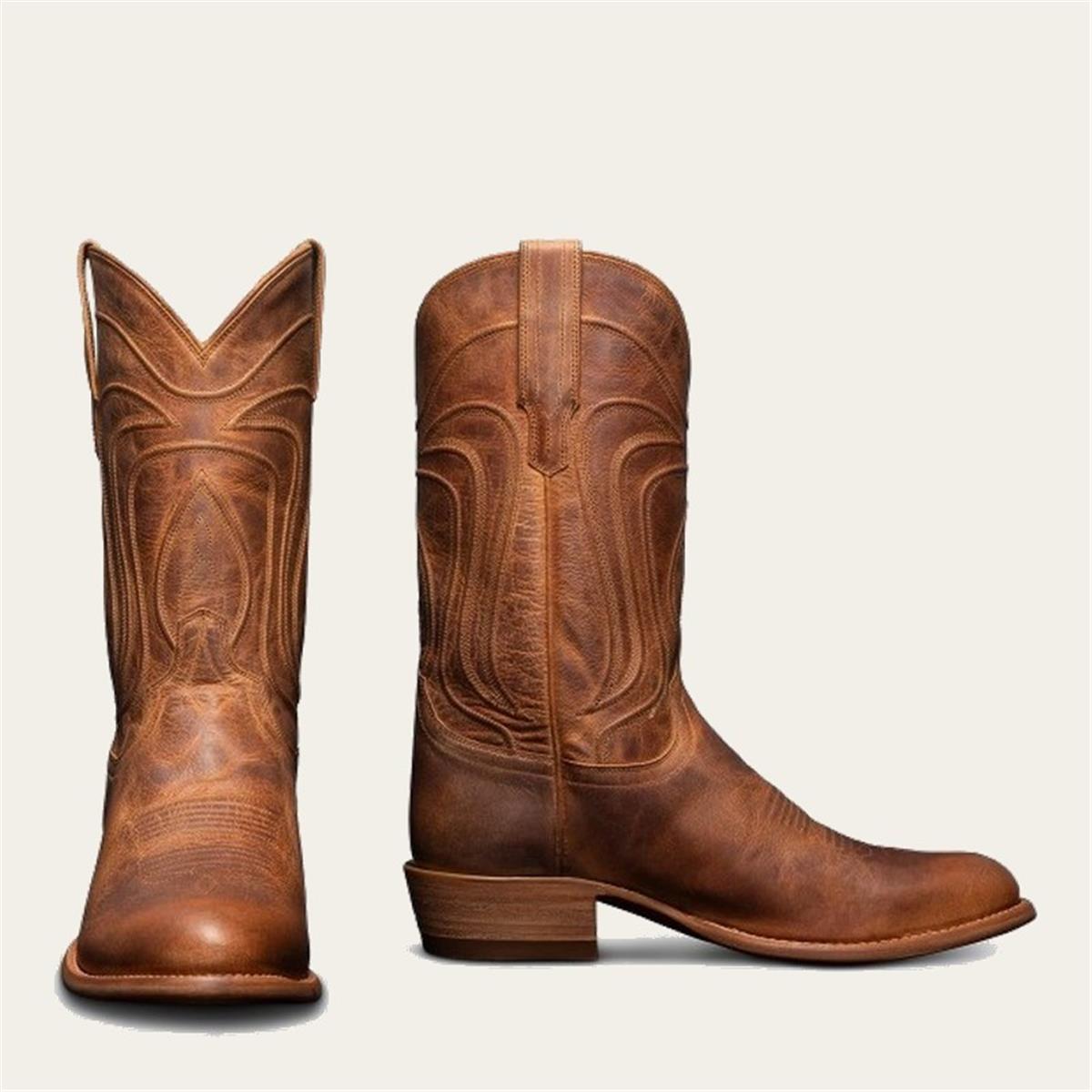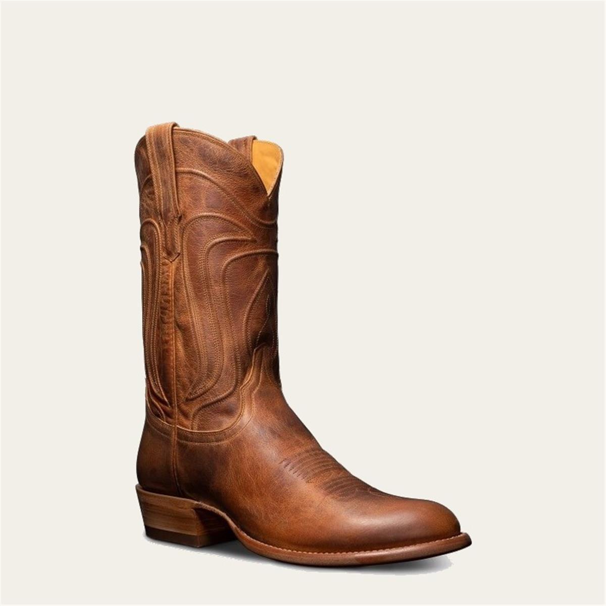 Our original cowboy boot is timelessly styled to look as good in 50 years as it does today. Its ageless nature starts with a classic round toe and 1 ½” stacked angled heel, and builds upon it with a vamp adorned with signature Tecovas toe stitching. A 12” shaft with hand-laid cording and reinforced pull straps complete its iconic western flair. You’re spoiled for choice: whether that be ultra-soft cowhide, rugged cowhide, or quick-to-patina goat. Suited up for an outdoor wedding, or decked out in denim and setting the dance floor ablaze at a honky tonk — The Cartwright was made for it.