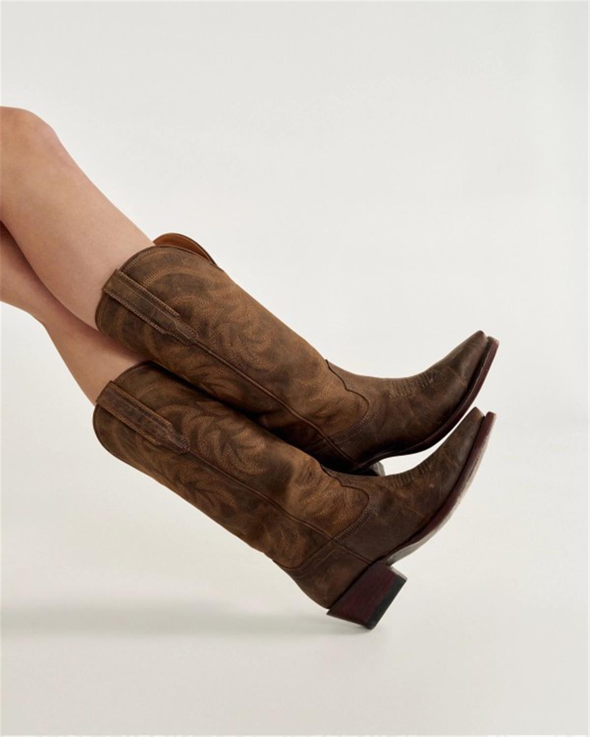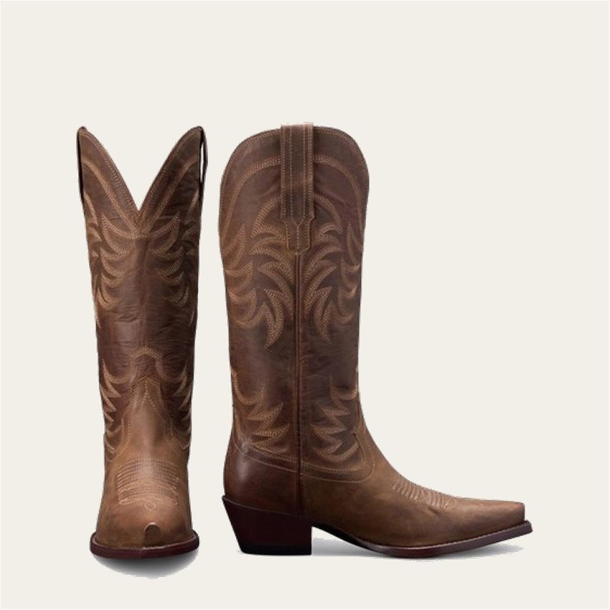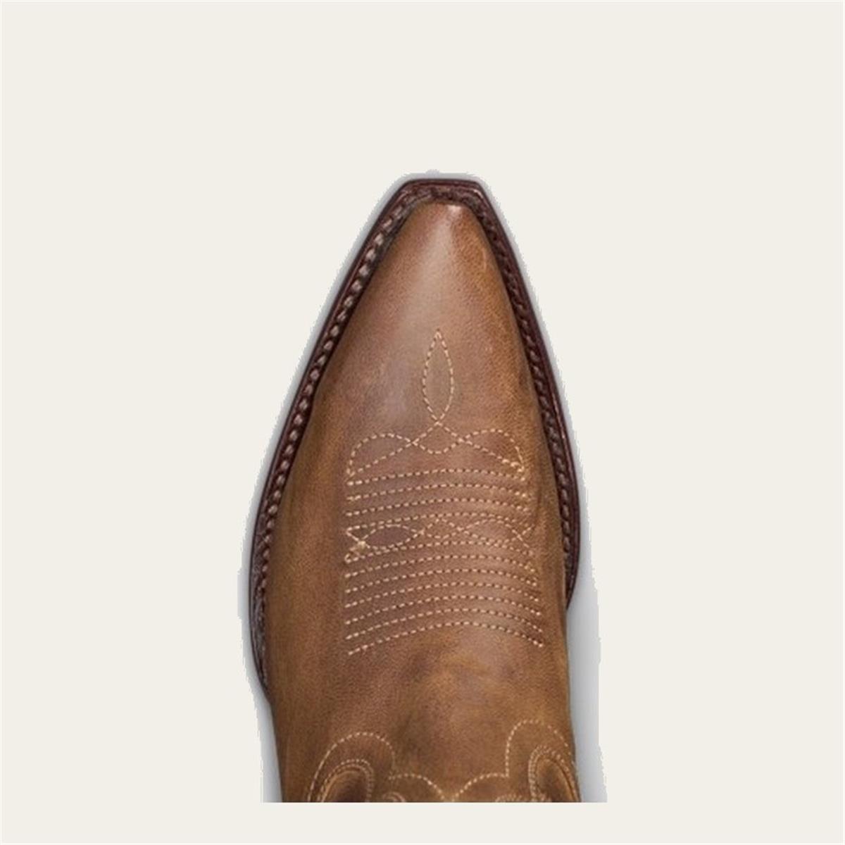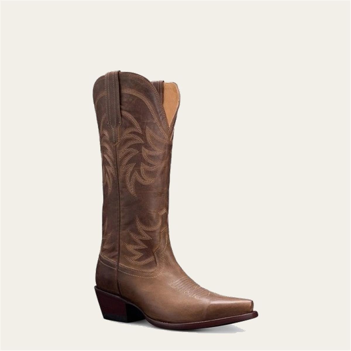 Meet The Annie, our best-selling cowgirl boot. Tall and timeless, a beautiful tonal stitching pattern adorns its 14” shaft, the top of which features a deep scallop for a comfortable, flattering fit. A fashion-forward snip toe leads the way and our signature toe stitching rounds out a classic look open to a wide range of styling possibilities. These premium boots are not to be missed and will age beautifully over time.