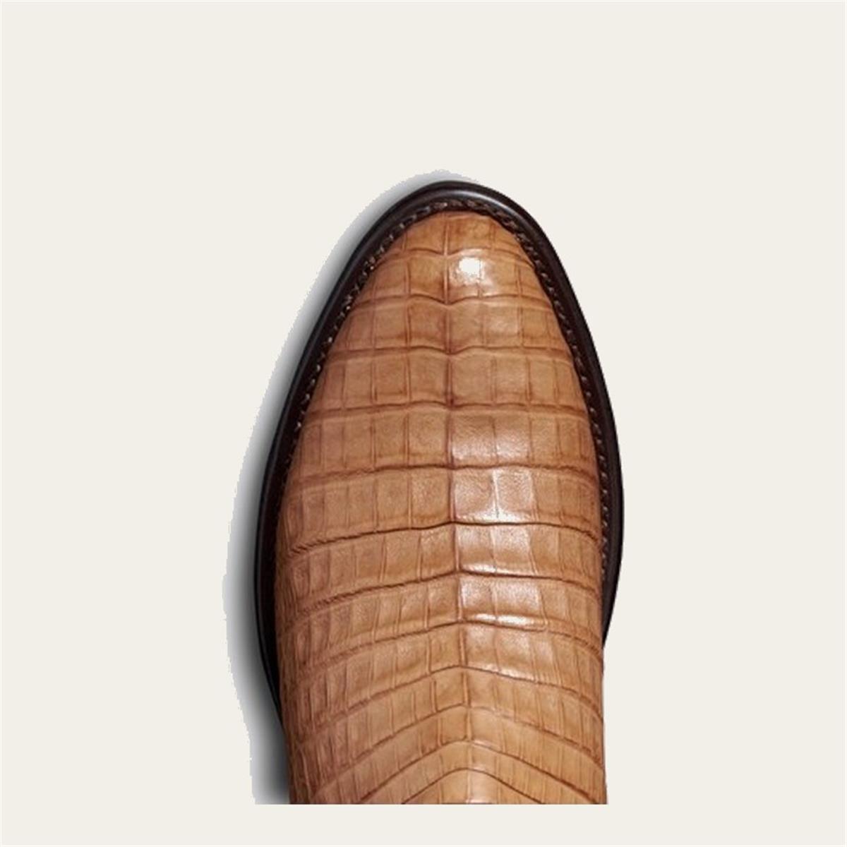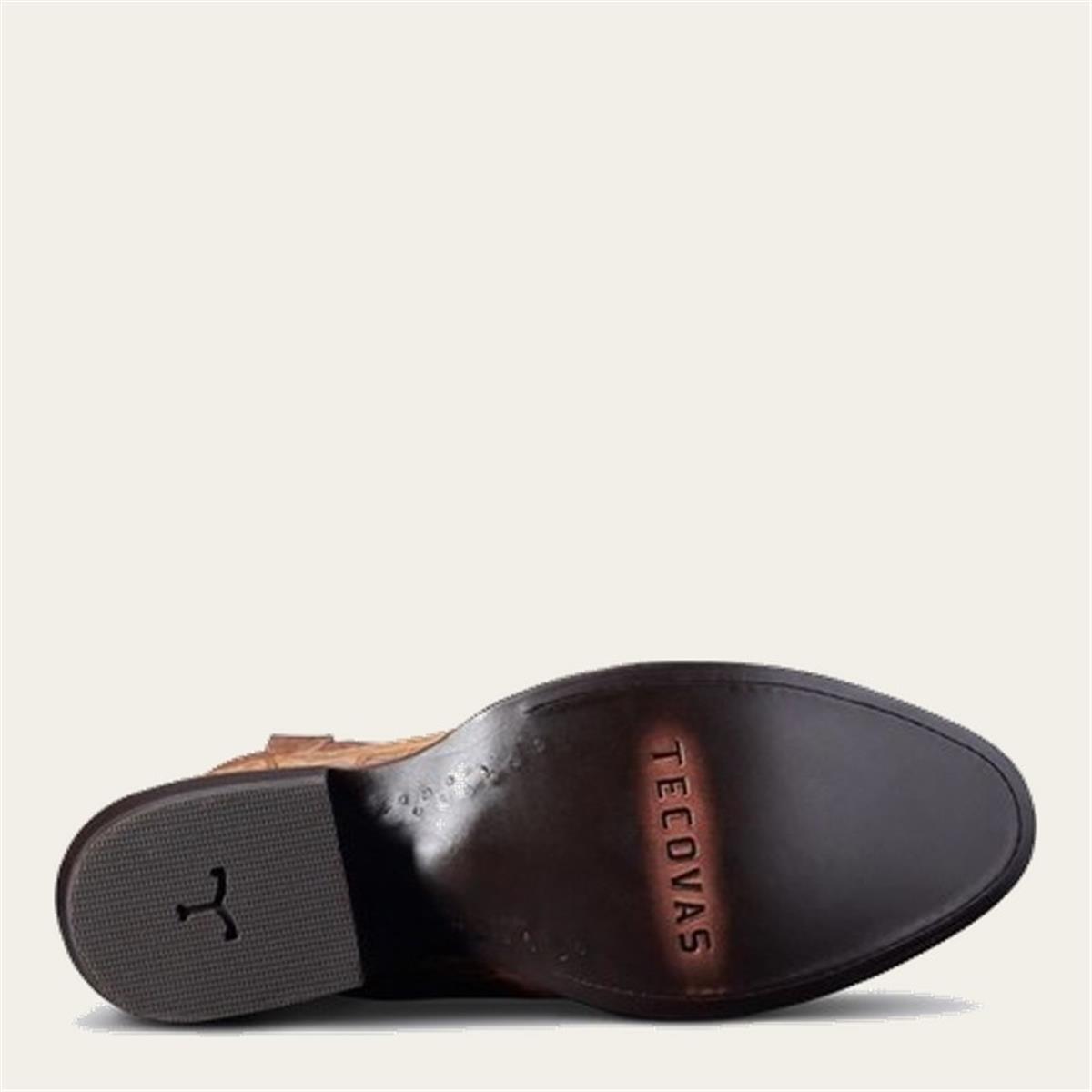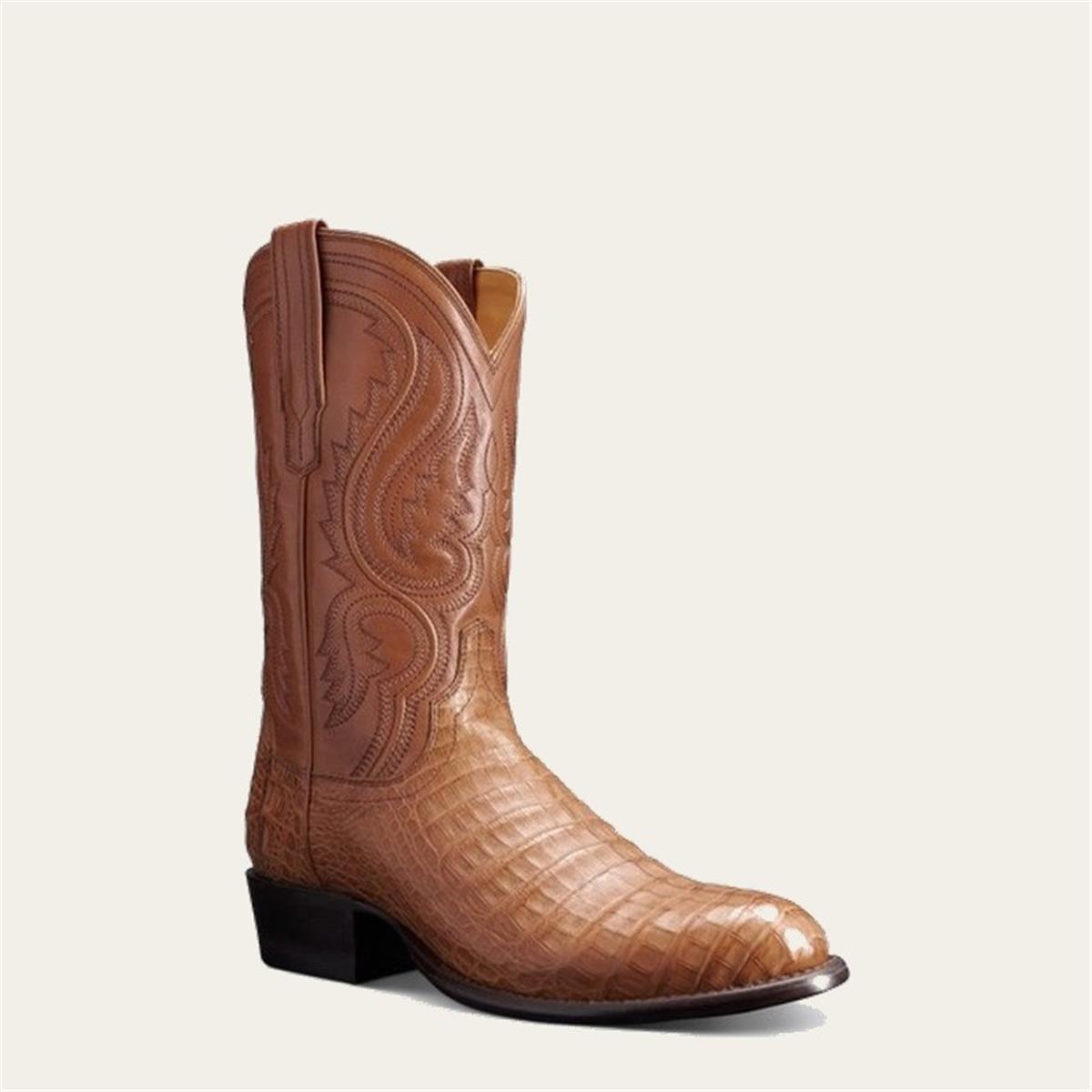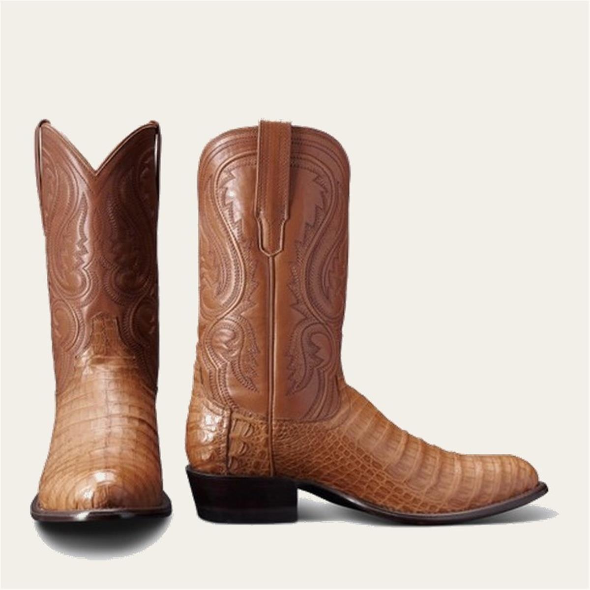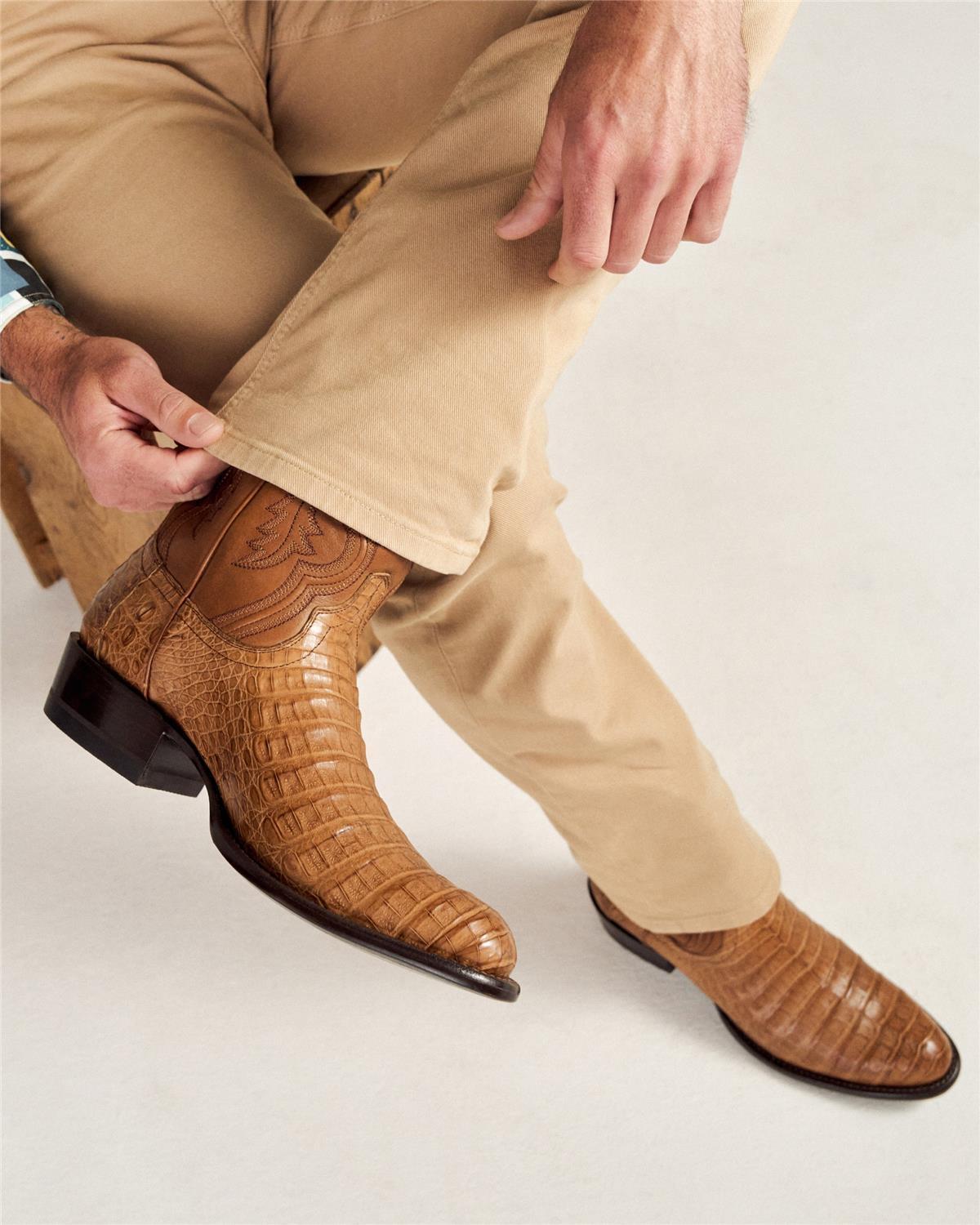 The Dillon is a striking exotic cowboy boot that has been updated with even more premium construction methods. Designed with exotic caiman belly hand-lasted in a timeless cowboy profile, stacked leather pitched heel with dual-layer rubber tap, and signature Tecovas hand-corded cowhide shaft to complete the elegant exotic profile. The Dillon features a hung leather lining, tri-layer leather insole with foam cushion cover, embedded steel shank, leather outsole, and Goodyear welt construction. Handcrafted in León, Mexico.