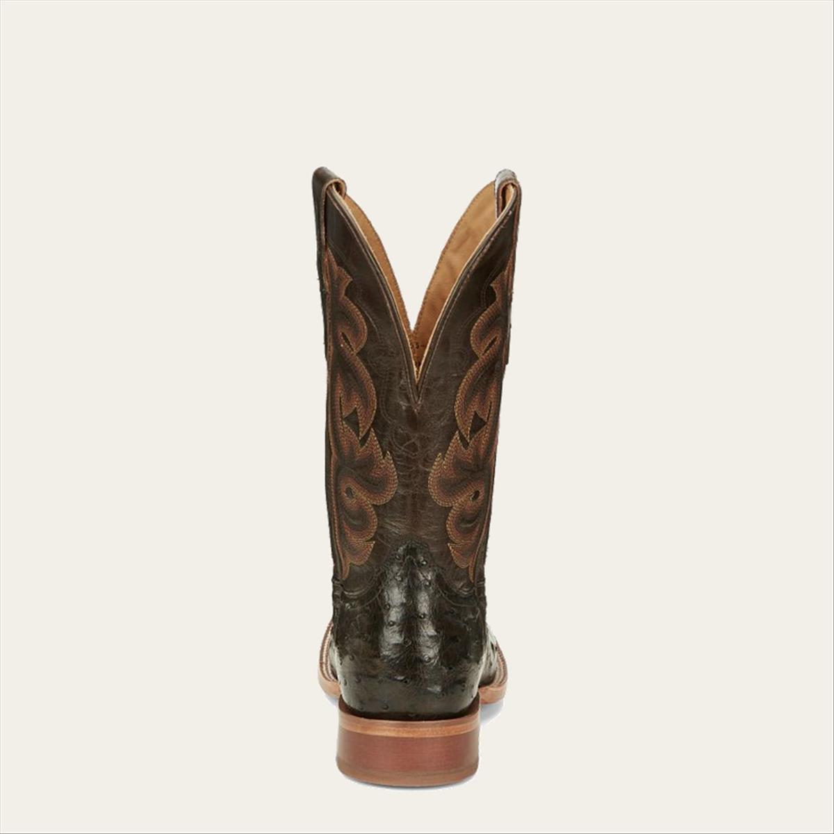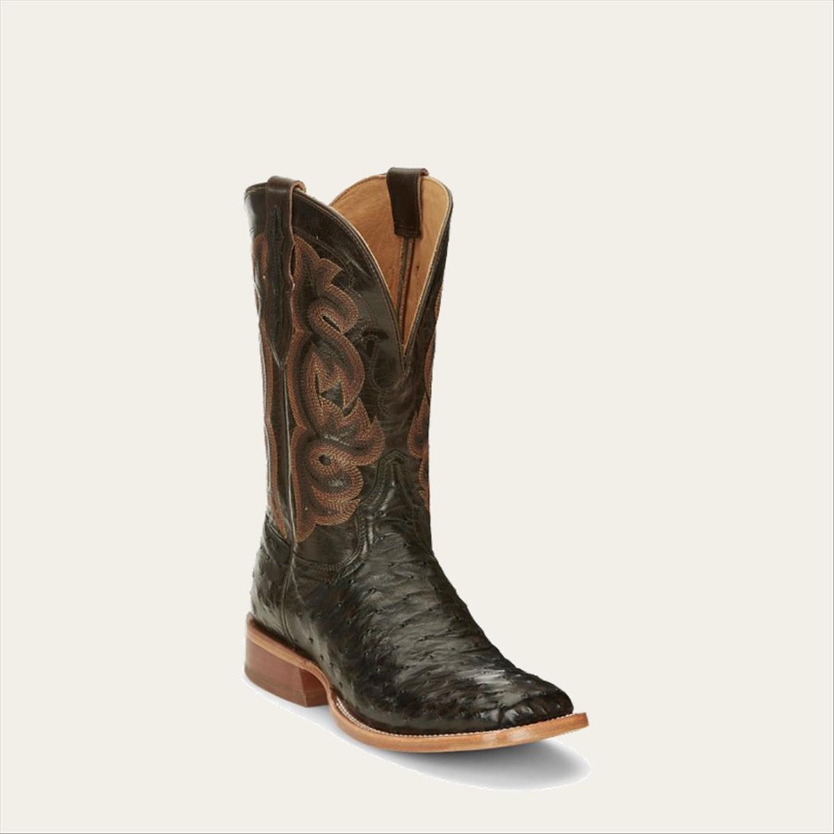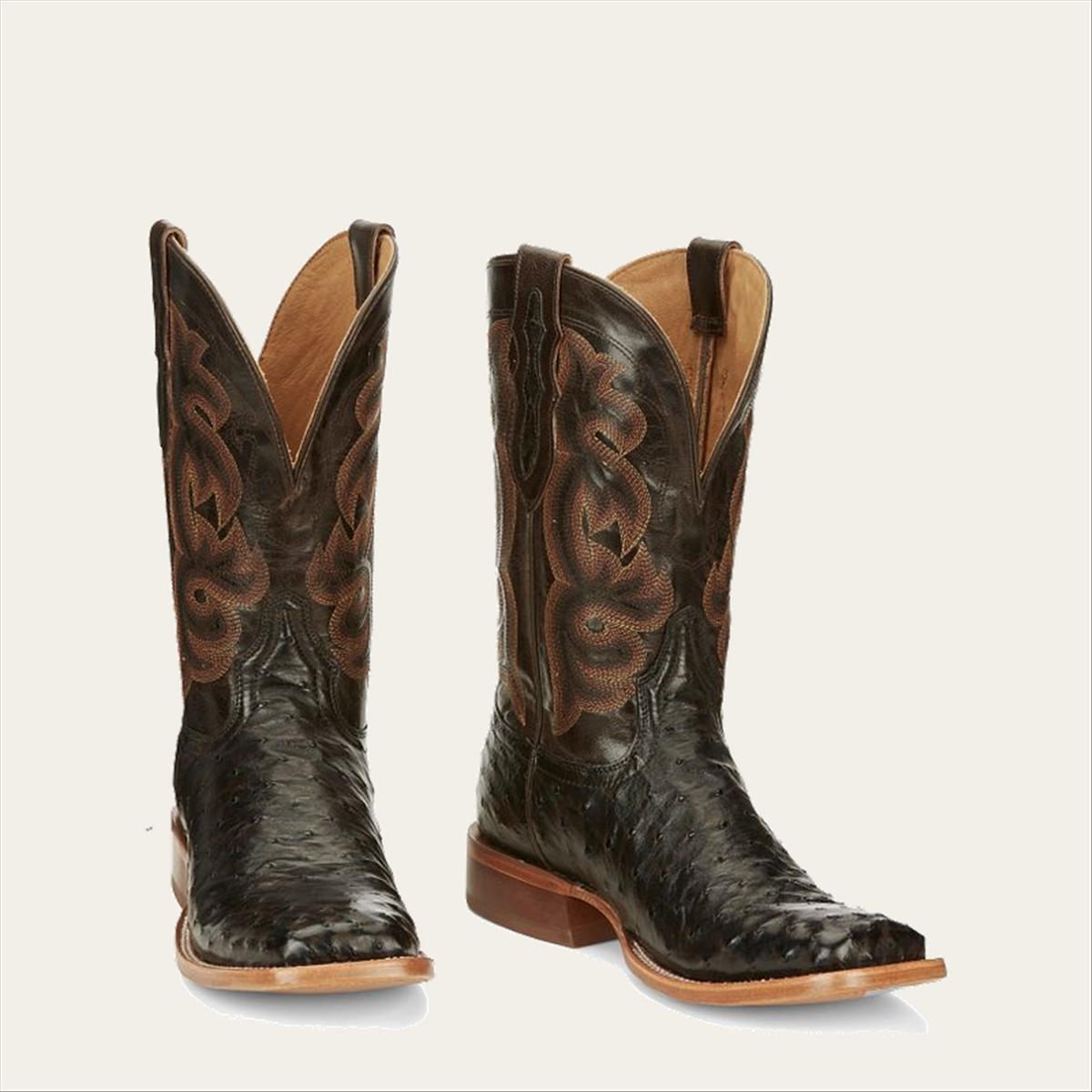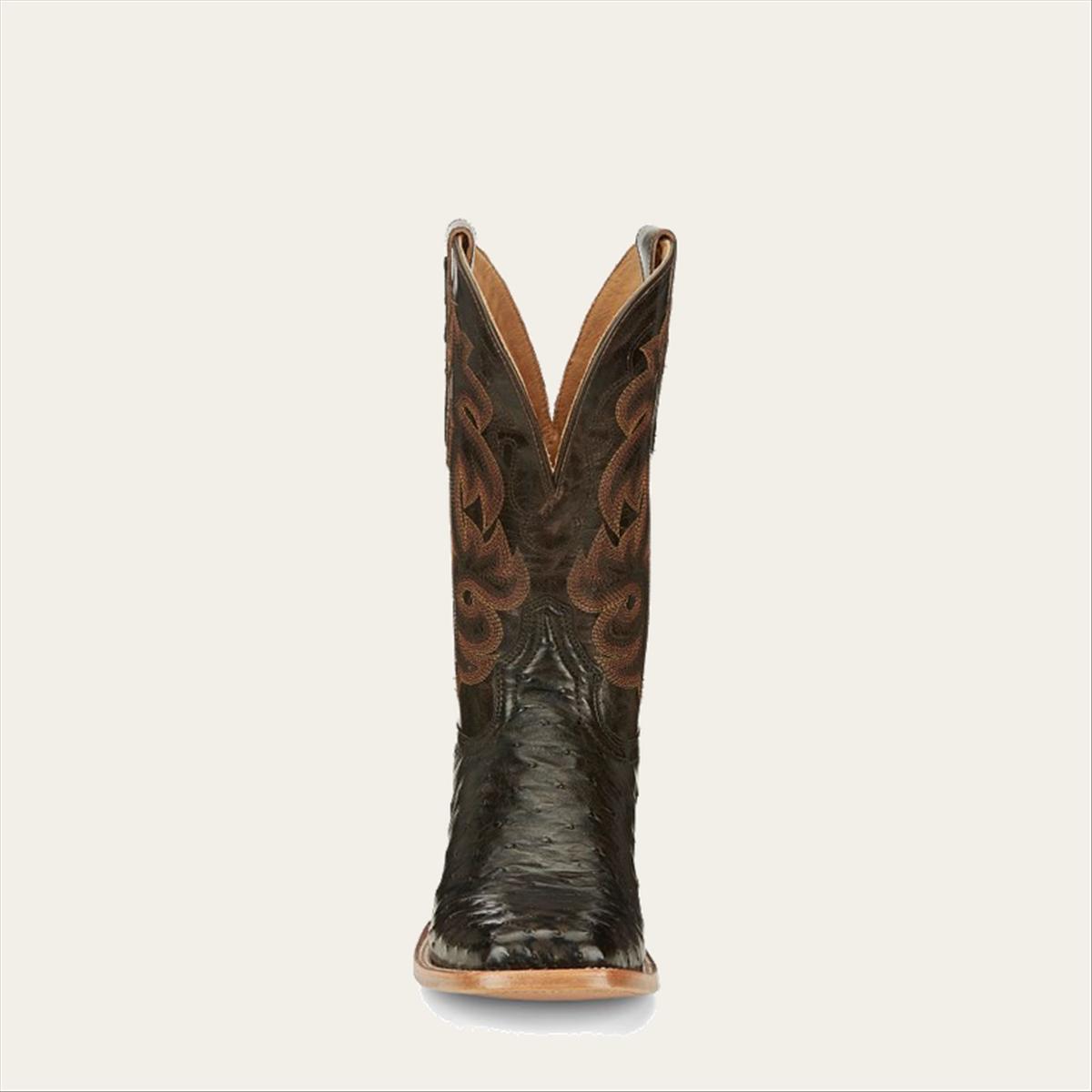 Revel in the dapper effect of this exclusive new finish that enhances each quill. The Quaid features a wide square toe outlined in a classy double stitch welt and Full Quill Ostrich vamp. The Umber Goat upper adorned in warm stitching complements the exotic leather vamp. Step into comfort with the removable Cushion Comfort Package® and classic Tony Lama craftsmanship.