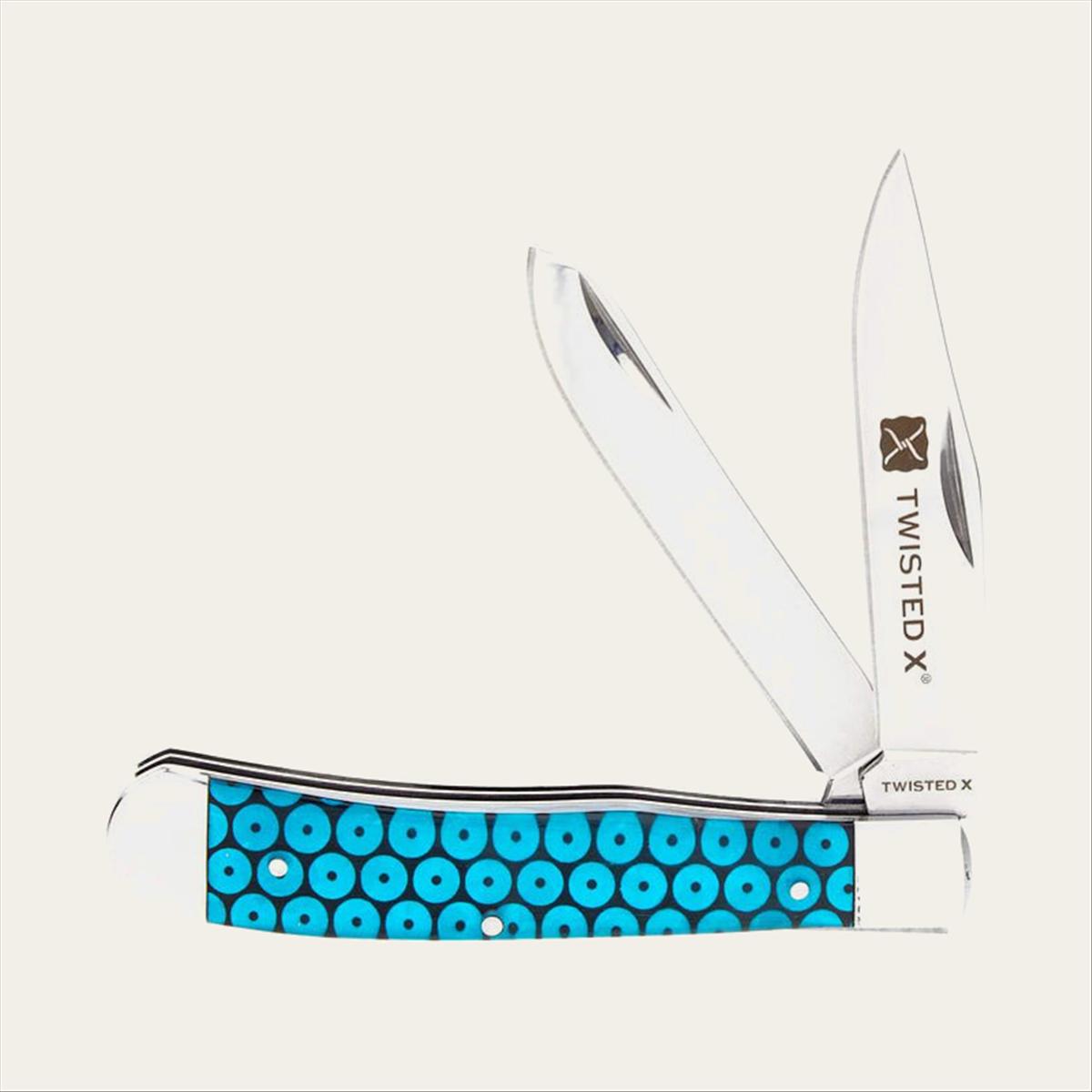 This Western Fashion Accessories knife is etched on one blade with Twisted X and packaged in a Twisted X box. The trapper is a great pocket knife for everyday carry displaying a color change blue with two nicely balanced bolsters.
